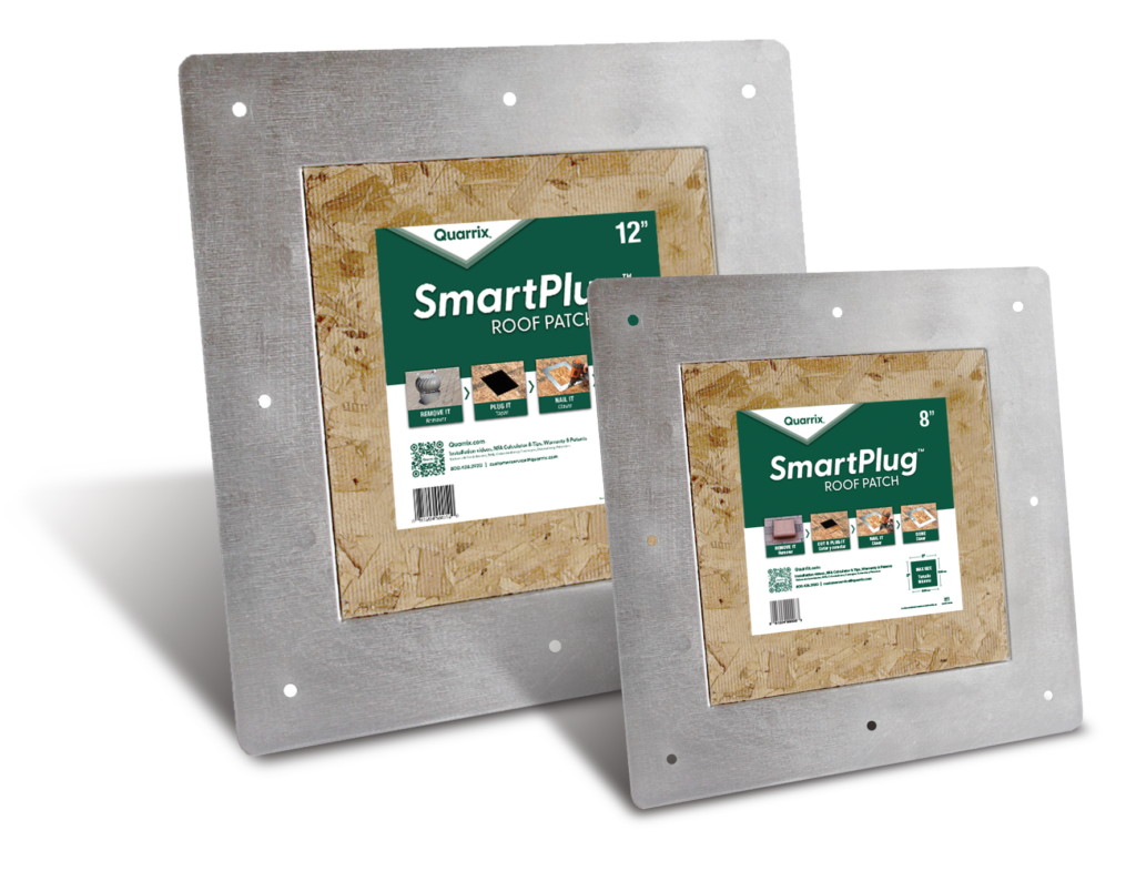 Work smarter not harder with the Quarrix SmartPlug™ Roof Patch, the quickest and easiest way to convert static vents to ridge ventilation. Available in 8” and 12” sizes, they’re made of heavy-duty 24-gauge galvanized steel with a reinforced backing that can withstand over 700 lbs. SmartPlug fits standard sized holes left by box, slant-back, and turbine vents.
